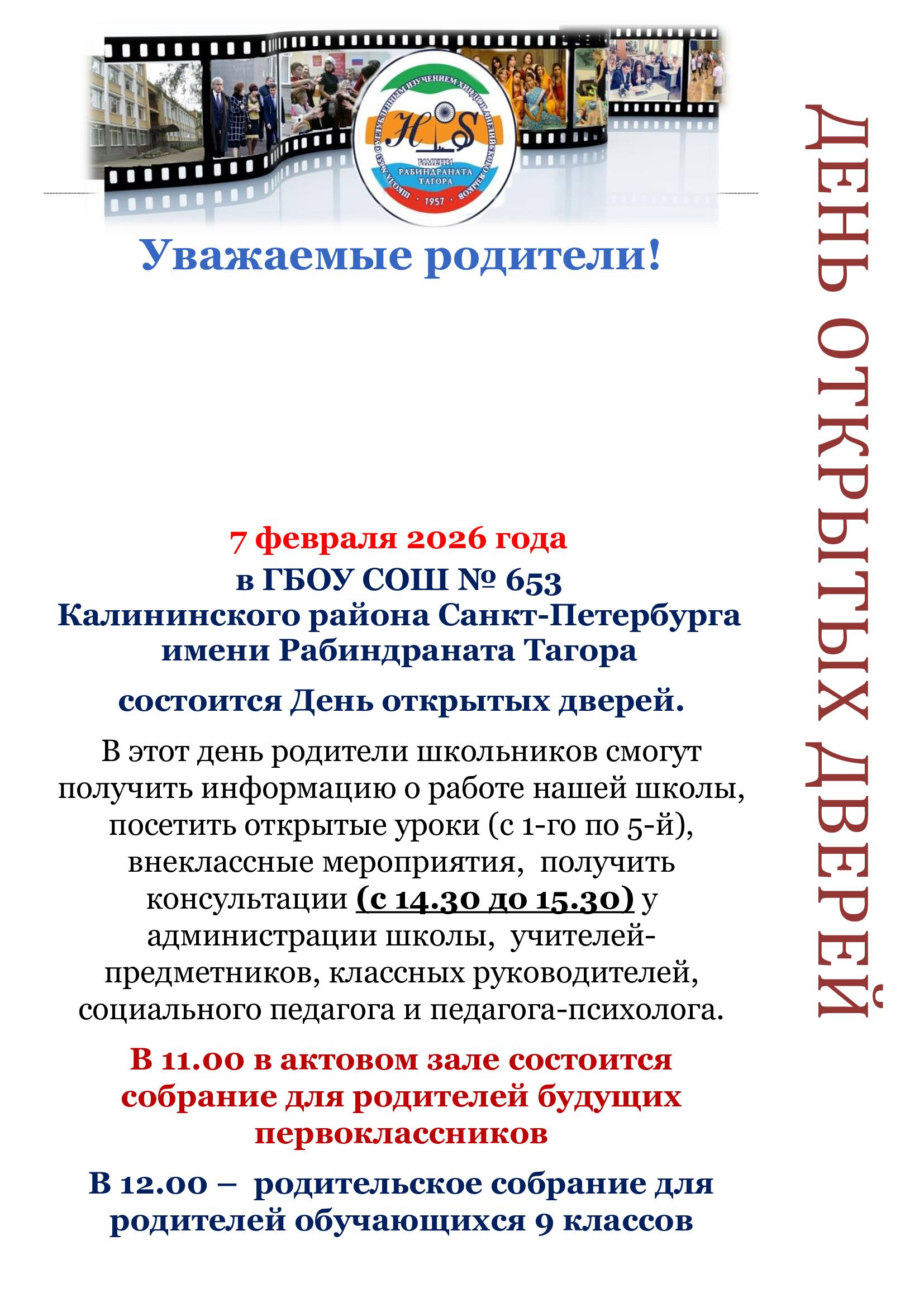 7 февраля 2026 года в ГБОУ СОШ № 653 Калининского района Санкт- Петербурга имени Рабиндраната Тагора состоится День открытых дверей.