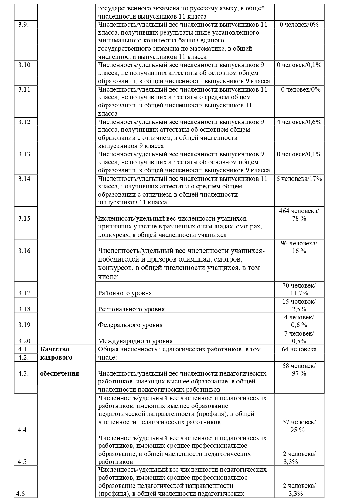 Результаты самообследования организации оформляются в виде отчета, включающего аналитическую часть и результаты анализа показателей деятельности организации, подлежащей самообследованию. Показатели деятельности образовательной организации отражены в таблице.