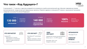 Бесплатное обучение стало возможным благодаря национальному проекту «Цифровая экономика». Ребята будут обучаются на курсах от ведущих ИТ-компаний и вузов. Они смогут не только бесплатно выучить востребованные языки программирования, но и освоить другие перспективные навыки ИТ-специалистов – разработка приложений и игр, аналитика данных и др.